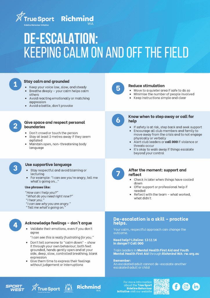 This resource provides simple, practical strategies to help coaches, volunteers, officials and spectators respond confidently when tensions rise.